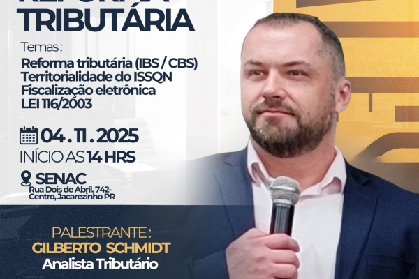 A Prefeitura Municipal de Jacarezinho, promove a Palestra Corporativa técnica e instrutiva para Profissionais da Contabilidade sobre a Reforma Tributária voltadas à empresas, escritórios de contabilidade, profissionais da área fiscal e tributária, Cooperativas, Bancos e cartórios.