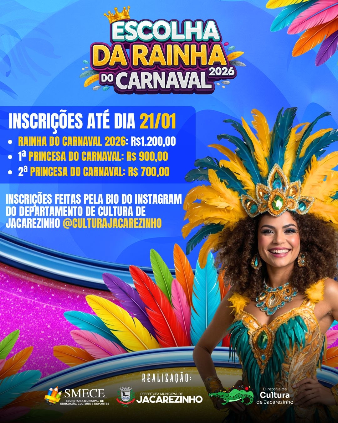 O Departamento Municipal de Cultura de Jacarezinho informa que estão abertas as inscrições para o Concurso Rainha do Carnaval 2026 – Jacarezinho Cidade do Samba