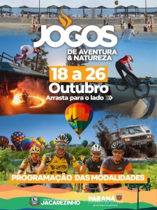 De 18 a 26 de outubro, Jacarezinho será sede de uma das etapas dos Jogos de Aventura e Natureza do Paraná, reunindo diversas modalidades esportivas e proporcionando momentos únicos de lazer, integração e emoção!