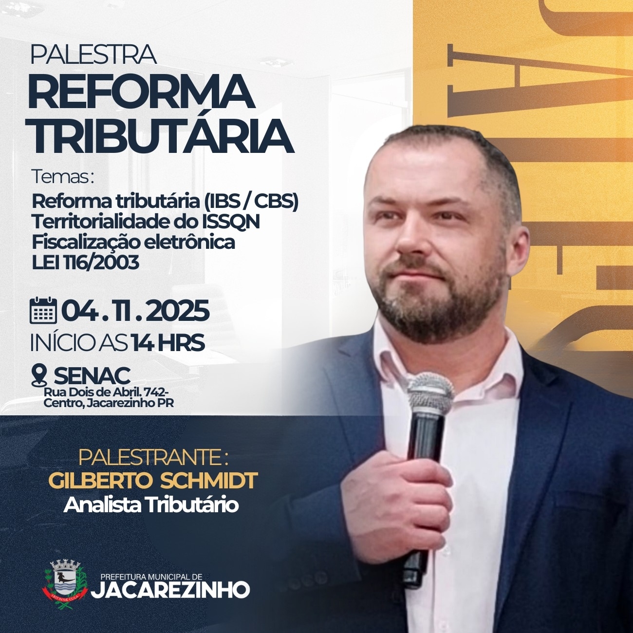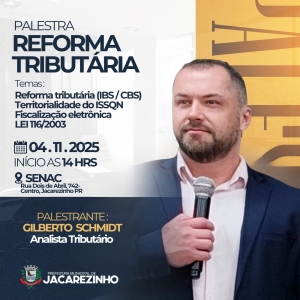 A Prefeitura Municipal de Jacarezinho, promove a Palestra Corporativa técnica e instrutiva para Profissionais da Contabilidade sobre a Reforma Tributária voltadas à empresas, escritórios de contabilidade, profissionais da área fiscal e tributária, Cooperativas, Bancos e cartórios.