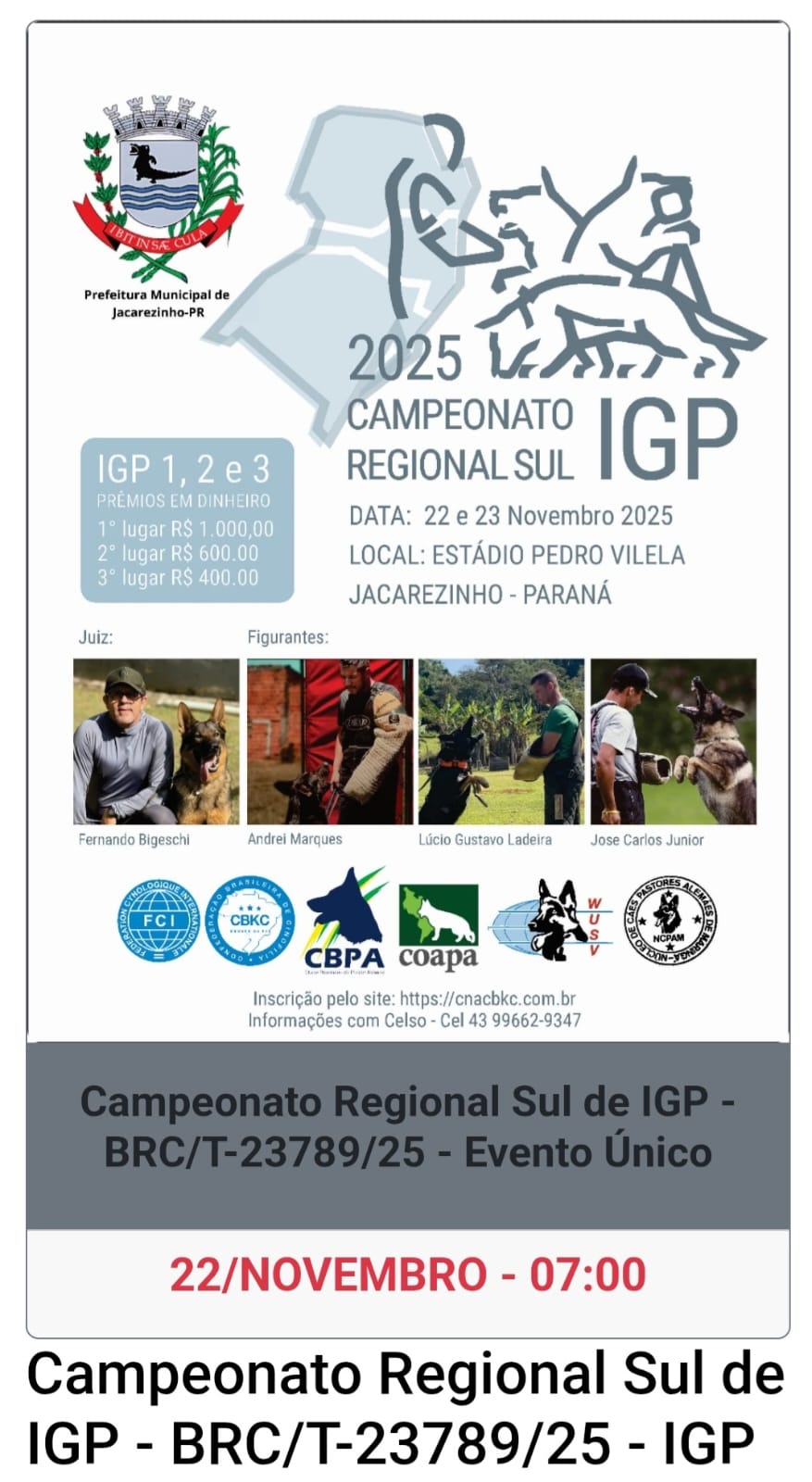 A Prefeitura de Jacarezinho convida toda a população para prestigiar o Campeonato Regional Sul, um grande evento dedicado ao adestramento de cães de trabalho e às habilidades esportivas de cães de alta performance.