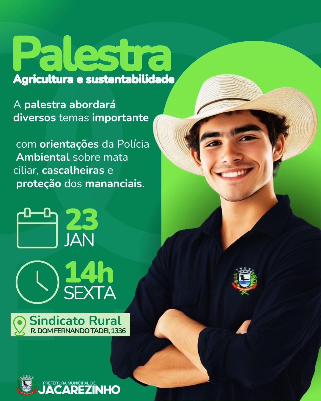 A Prefeitura Municipal de Jacarezinho, por meio da Secretaria Municipal de Agricultura, Pecuária e Meio Ambiente, convida produtores, estudantes e toda a comunidade para participar da Palestra sobre Agricultura e Sustentabilidade.