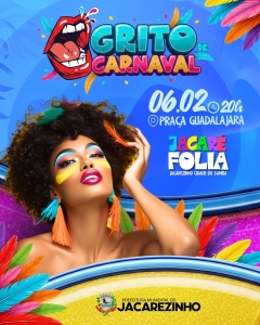 A Prefeitura de Jacarezinho, por meio da Secretaria Municipal de Cultura e Turismo, convida toda a população para o Grito de Carnaval, que dá início à programação do Jacaré Folia 2026. O evento acontece no dia 06 de fevereiro, a partir das 20h, na Praça Guadalajara (Vila São Pedro).