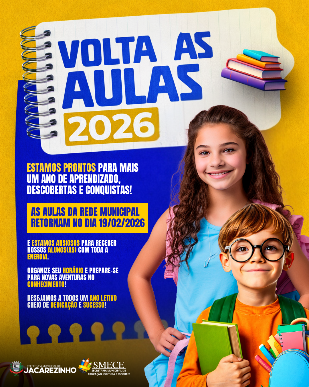 A Prefeitura Municipal de Jacarezinho por meio da Secretaria Municipal de Educação informa que o ano letivo de 2026 já vai começar! As aulas da Rede Municipal de Ensino retornam no dia 19 de fevereiro de 2026, marcando o início de mais um ciclo de aprendizado, descobertas e conquistas.