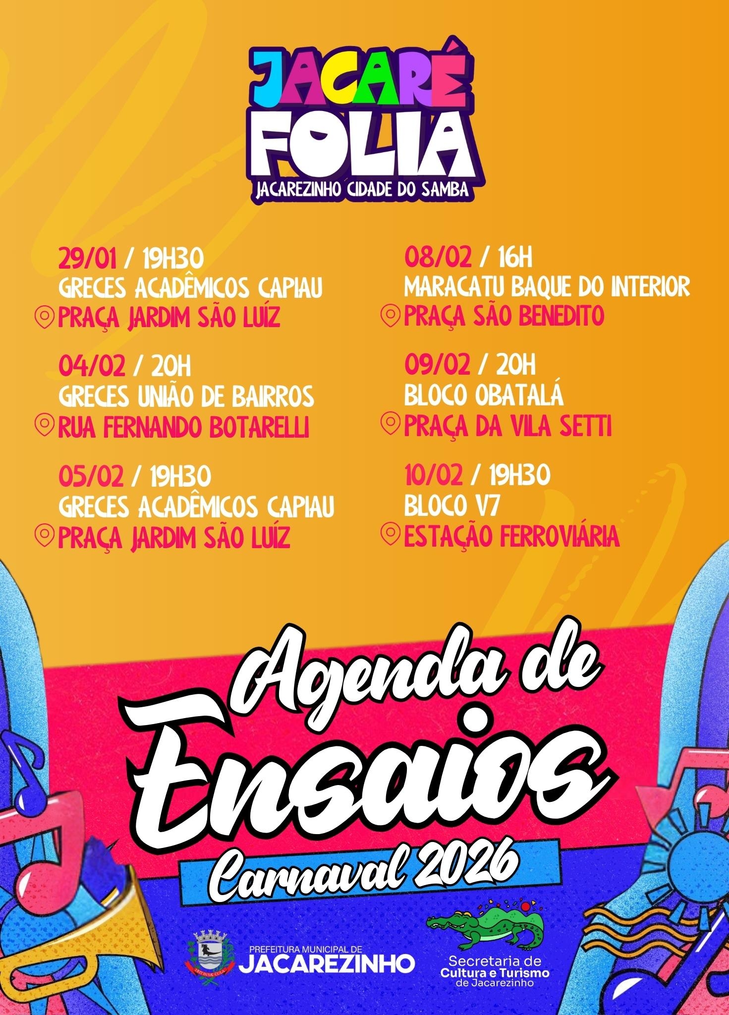 Organizados pela Prefeitura Municipal de Jacarezinho, por meio da Secretaria de Cultura e Turismo, os ensaios integram a agenda oficial do Carnaval Jacaré Folia – Jacarezinho, Cidade do Samba, levando música, ritmo e ocupação cultural a diferentes espaços da cidade, fortalecendo o vínculo entre as agremiações e a comunidade.