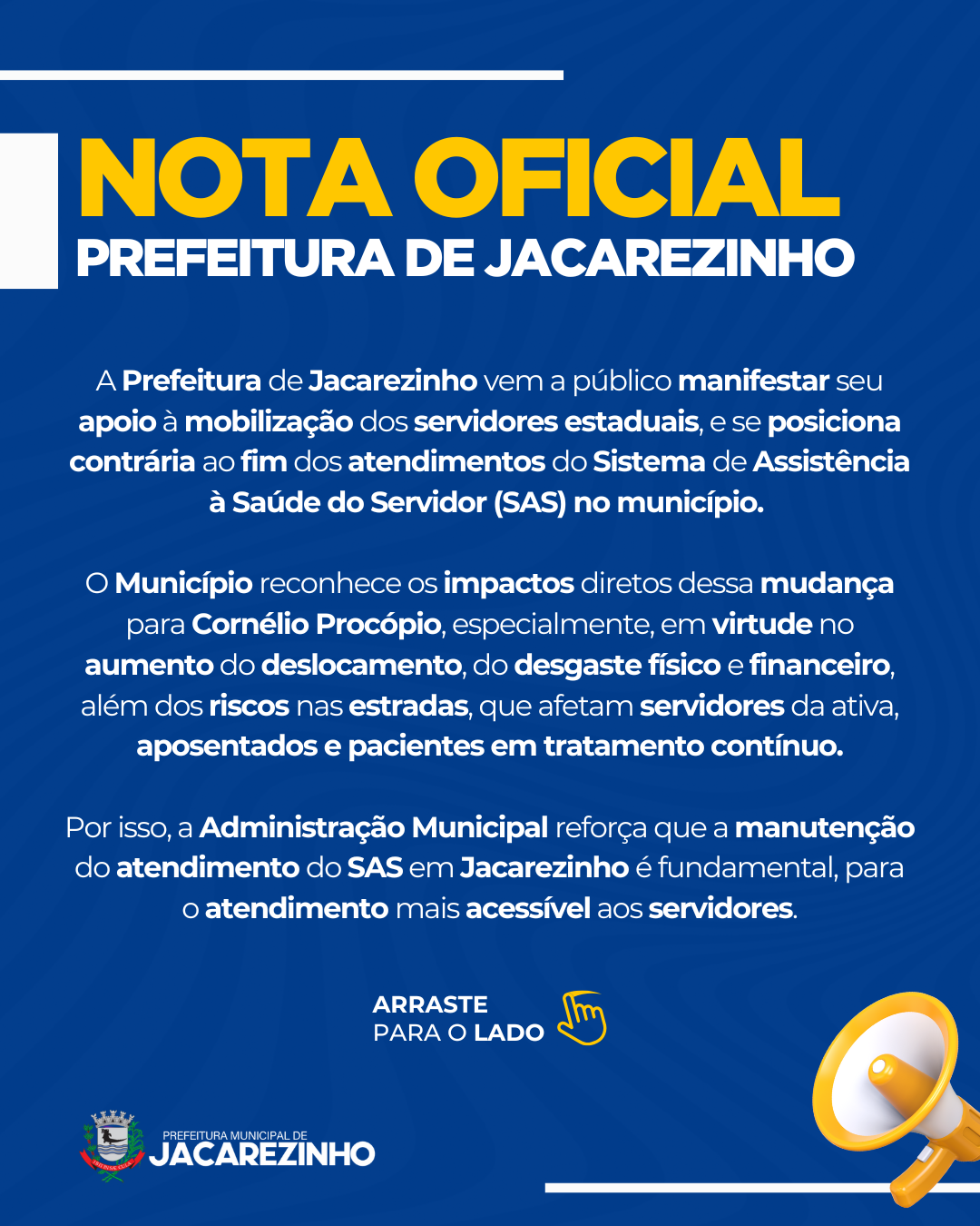 E dentro dos limites legais e institucionais, a Prefeitura de Jacarezinho já oficiou a Secretaria de Estado de Administração e Previdência para diálogo, e se coloca à disposição para colaborar com os órgãos competentes, buscando alternativas que minimizem os impactos à população e preservem o acesso digno à saúde.