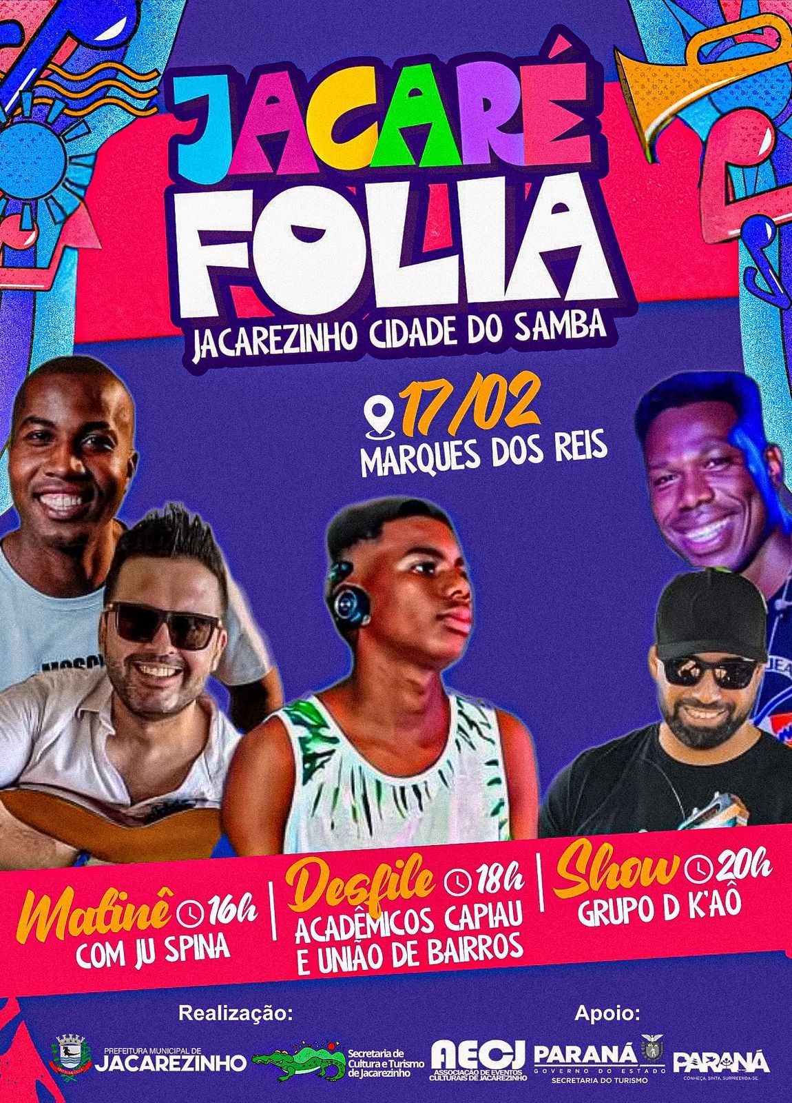 A Prefeitura Municipal de Jacarezinho divulga a programação oficial do Carnaval 2026 - Jacaré Folia, que promete dias de muita música, alegria e celebração da cultura popular, reunindo grandes atrações e valorizando o samba e o carnaval da cidade.