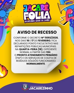 A Prefeitura de Jacarezinho informa que, conforme o Decreto nº 11.093/2026, será declarado ponto facultativo nos dias 16 e 17 de fevereiro nas repartições públicas municipais. O atendimento ao público será retomado na quarta-feira (18), com expediente normal a partir das 13h.