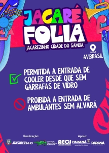 A Prefeitura de Jacarezinho informa que, durante o Jacaré Folia 2026 na Avenida Brasil, será permitida a entrada de cooler, desde que não contenha garrafas de vidro.