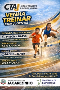 A Prefeitura de Jacarezinho, por meio da Secretaria Municipal de Esportes e Lazer, convida crianças e adolescentes para participarem dos treinos do Centro de Treinamento de Atletismo de Jacarezinho (CTAJ).