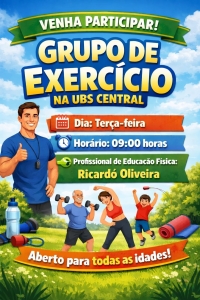 A Prefeitura de Jacarezinho por meio da Secretária Municipal de Saúde convida a população para participar do grupo de exercício da UBS Central, uma iniciativa que promove mais saúde, qualidade de vida e bem-estar para todos.