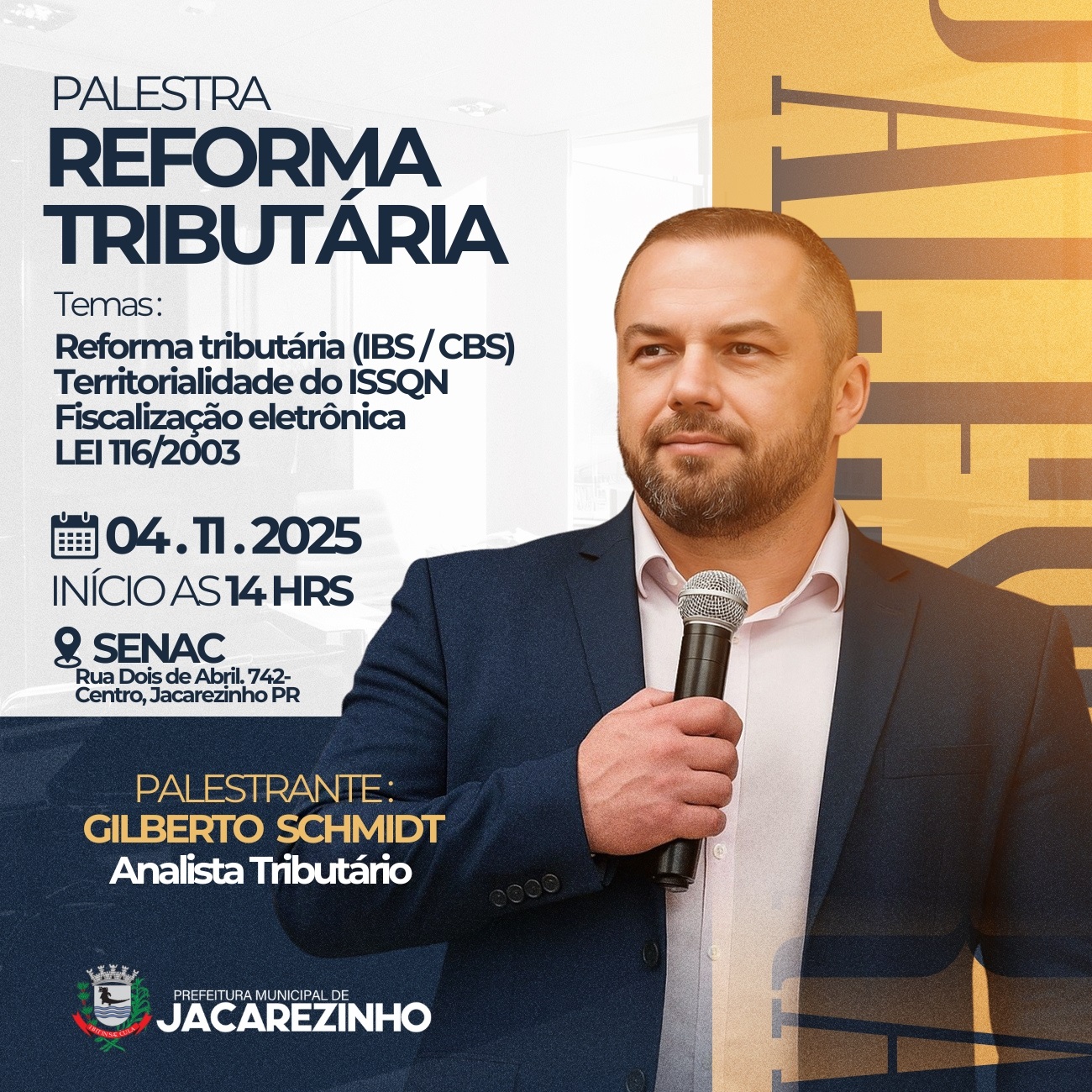 A Prefeitura Municipal de Jacarezinho, promove a Palestra Corporativa técnica e instrutiva para Profissionais da Contabilidade sobre a Reforma Tributária voltadas à empresas, escritórios de contabilidade, profissionais da área fiscal e tributária, Cooperativas, Bancos e cartórios.