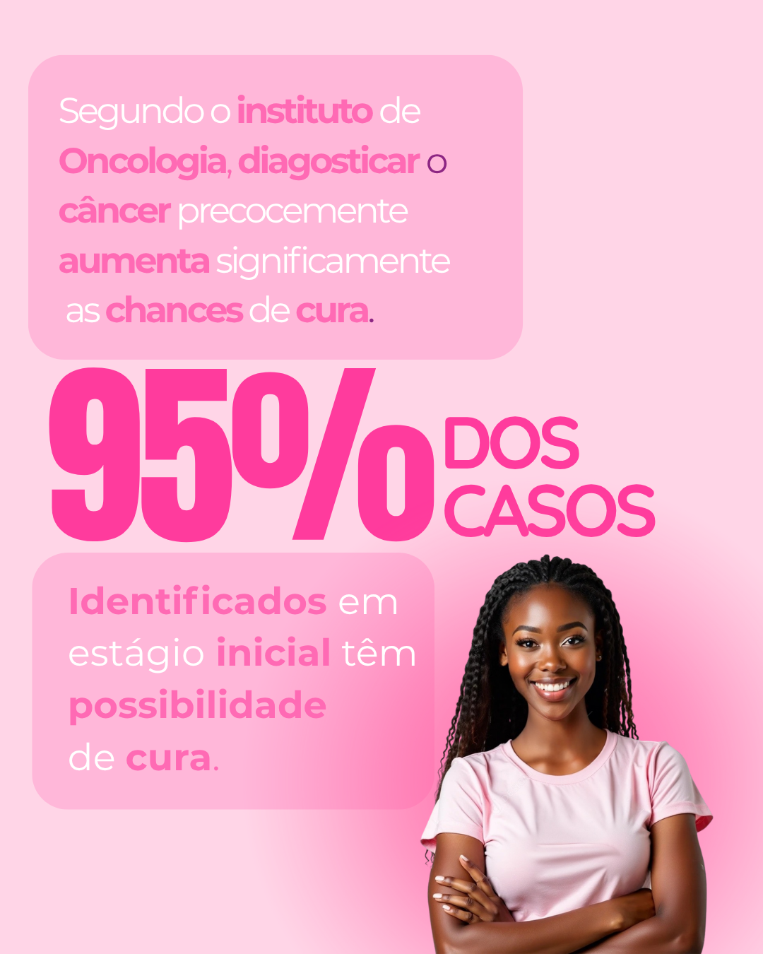 O diagnóstico precoce é fundamental, 95% dos casos de câncer de mama identificados em estágio inicial, tendo chance de cura.