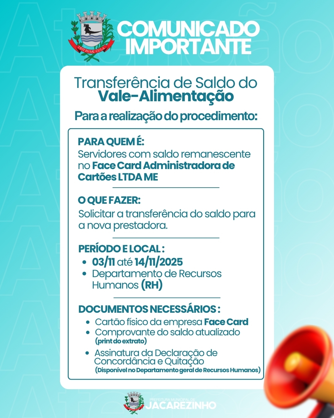 A Prefeitura de Jacarezinho, por meio da Secretaria de Administração, informa que os servidores com saldo remanescente no cartão da empresa Face Card Administradora de Cartões LTDA ME deverão solicitar a transferência do valor para a nova prestadora.
