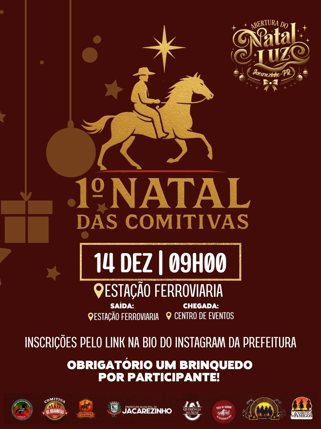 A Prefeitura de Jacarezinho, em parceria com as comitivas do município, convida toda a população para participar do 1º Natal das Comitivas, um evento inédito que promete reunir tradição, solidariedade e muita festa!