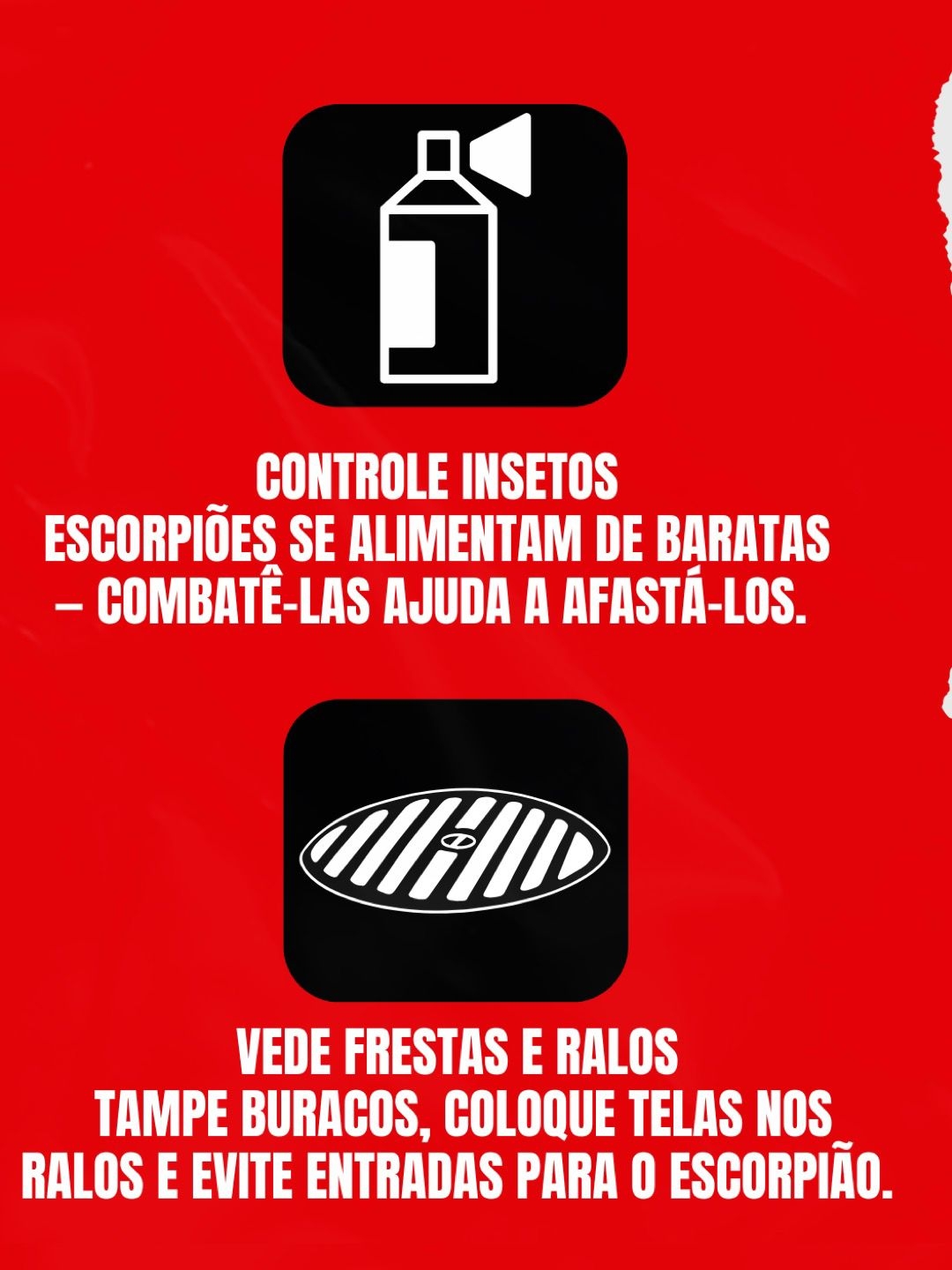 É importante sacudir roupas e calçados antes de usar, manter o quintal limpo e livre de entulhos, controlar insetos que servem de alimento aos escorpiões e vedar frestas, buracos e ralos, instalando telas quando possível.