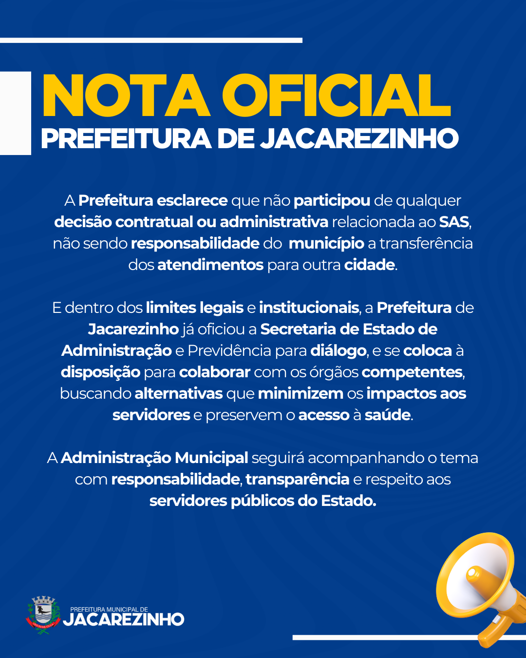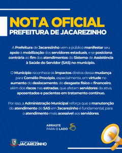E dentro dos limites legais e institucionais, a Prefeitura de Jacarezinho já oficiou a Secretaria de Estado de Administração e Previdência para diálogo, e se coloca à disposição para colaborar com os órgãos competentes, buscando alternativas que minimizem os impactos à população e preservem o acesso digno à saúde.