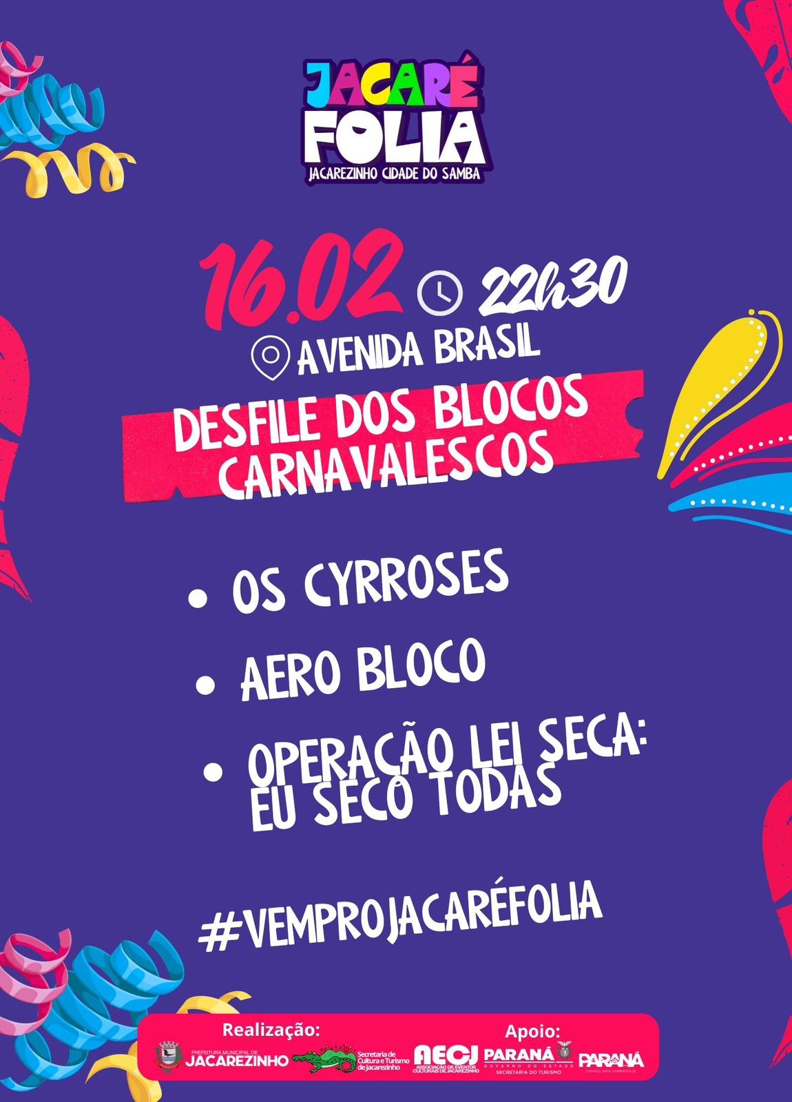 É dia 16/02, a partir das 22h30, no Desfile dos Blocos Carnavalescos do Jacaré Folia.