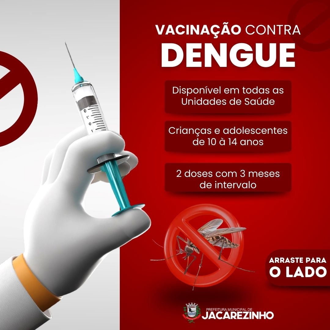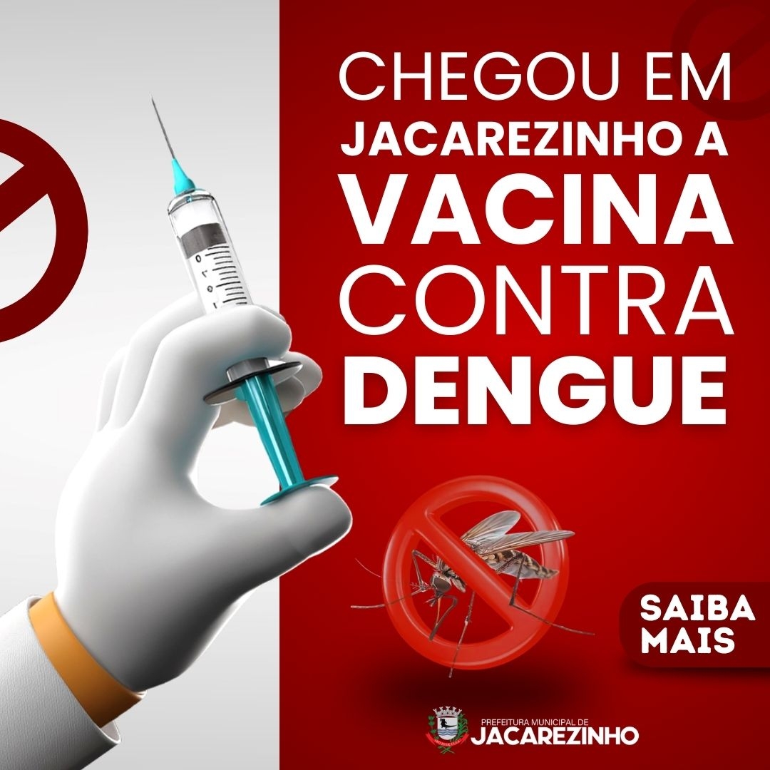 A Prefeitura de Jacarezinho, por meio da Secretaria Municipal de Saúde, informa que a vacina contra a dengue chegou no município, ela não substitui os hábitos de evitar criadouros, e está disponível em todas as Unidades de Saúde do município para crianças e adolescentes de 10 a 14 anos.