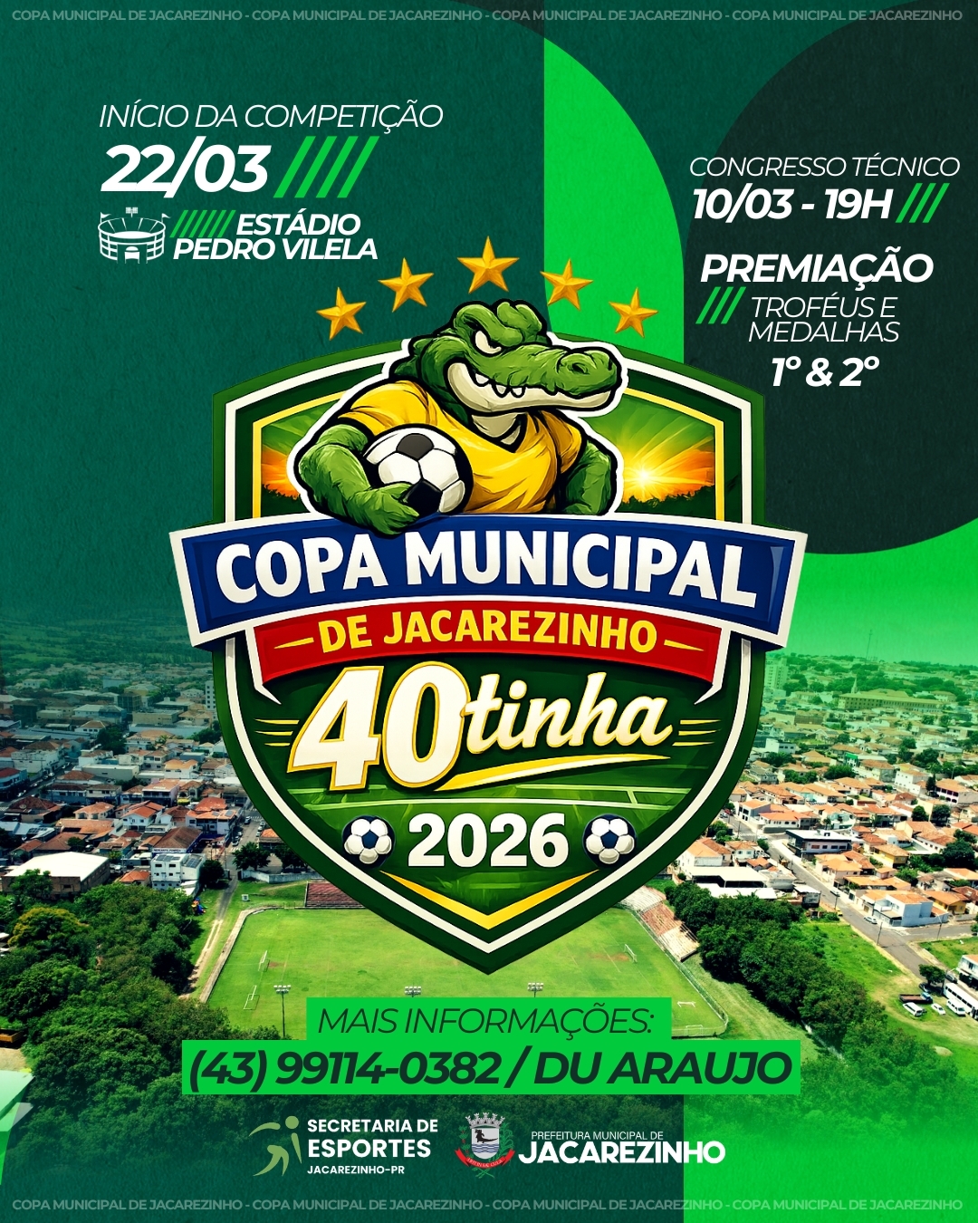 A Prefeitura de Jacarezinho, por meio da Secretaria Municipal de Esportes, anuncia a realização da tradicional Copa Municipal “Quarentinha” 2026, competição voltada especialmente para atletas com 40 anos ou mais, uma das mais aguardadas do calendário esportivo do município.