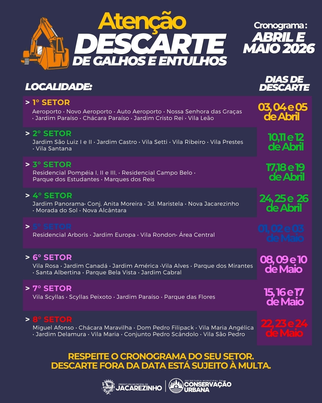 Atenção: Respeite o cronograma do seu setor. O descarte fora das datas estabelecidas está sujeito à multa.