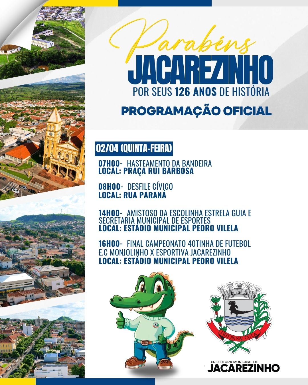 A Prefeitura de Jacarezinho convida toda a população para participar das comemorações pelos 126 anos de história do município, com uma programação preparada para celebrar essa data tão importante.