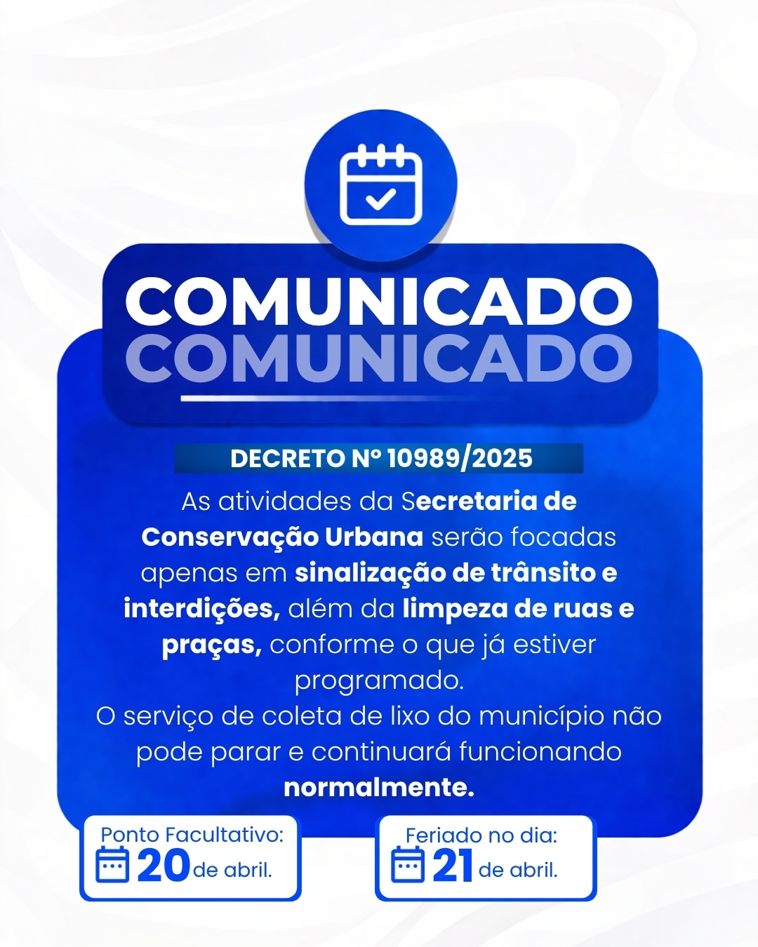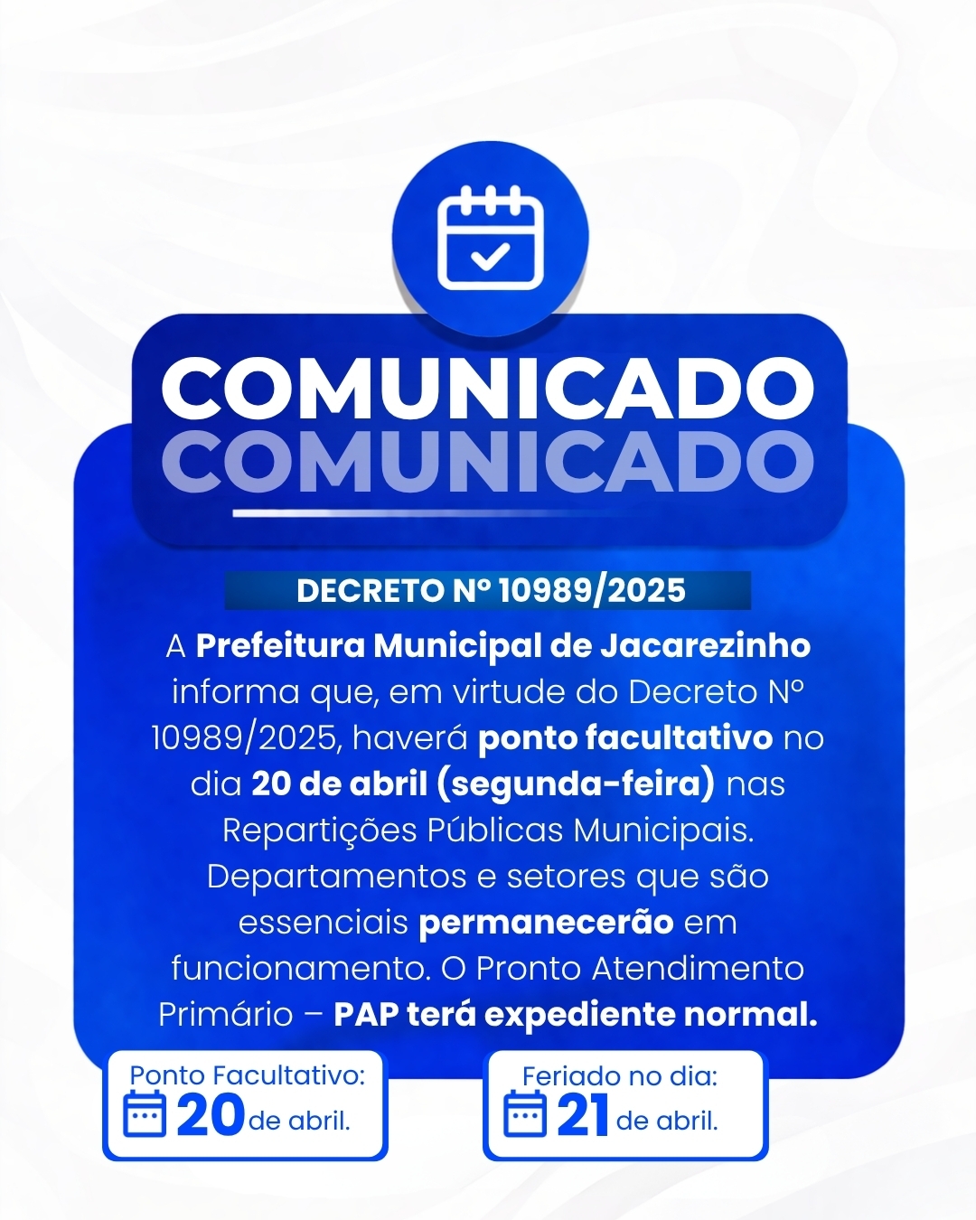 A Prefeitura Municipal de Jacarezinho informa que, conforme o Decreto nº 11.214/2026, será considerado ponto facultativo nas repartições públicas municipais no dia 20 de abril.