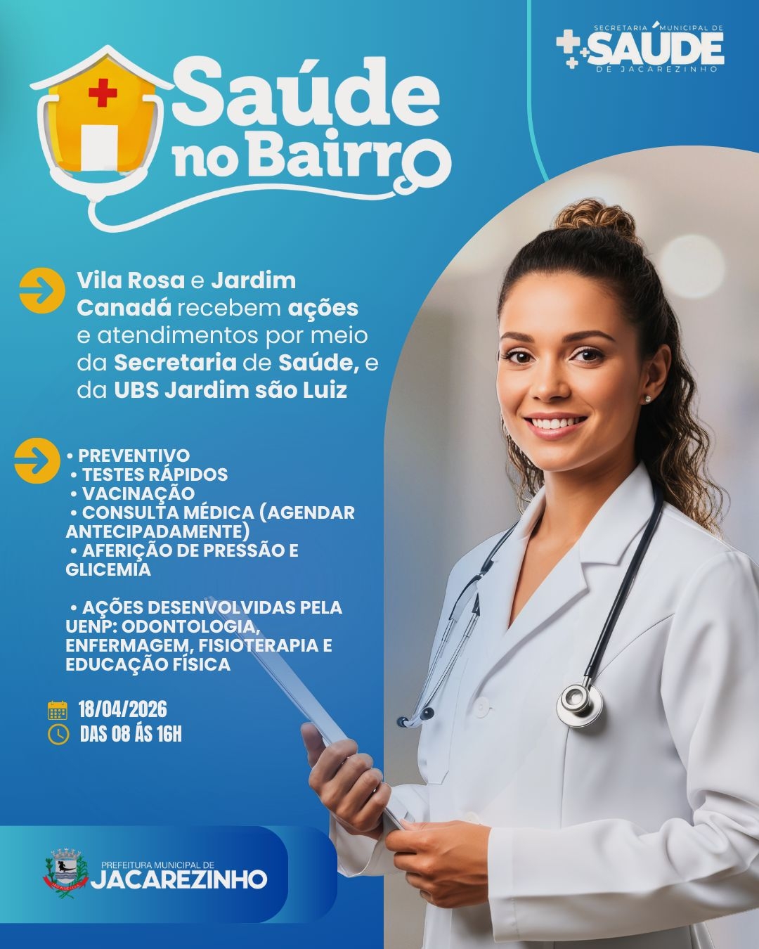 A Prefeitura de Jacarezinho, por meio da Secretaria Municipal de Saúde, realiza mais uma ação do programa Saúde no Bairro, levando atendimentos e serviços essenciais para a população da Vila Rosa e do Jardim Canadá, com apoio da UBS Jardim São Luiz.